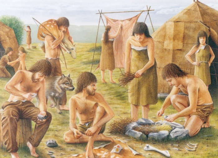 صنعت الملابس الأولى من العناصر الطبيعية المتوفرة في البيئة، مثل جلود الحيوانات، والفراء، والعشب، والأوراق، والعظام، والأصداف. غالبًا كانت هذه الملابس مربوطة أو شبه مربوطة، إلا أن وجود إبر بسيطة مصنوعة من عظام الحيوانات يشير إلى وجود جلود مخيطة وملابس مصنوعة من الفراء منذ نحو 30,000 عام.