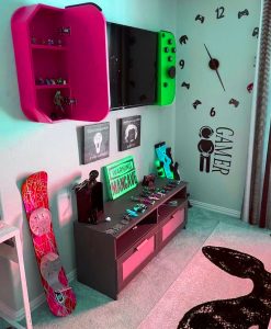 للحصول على مظهر تقني أكثر ، نقترح عليك استخدام الألواح ثلاثية الأبعاد لجدار غرفة الألعاب. في رأينا ، يتناسب ديكور الحائط المغطى بألواح ثلاثية الأبعاد بشكل جيد للغاية مع موضوع ديكور غرفة الألعاب. بالإضافة إلى ذلك ، بالنسبة للمراهقين ، فإن أفضل رهان هو الحصول على خلفية مطبوعة عليها لاعب اللعبة المفضل لديهم. بالإضافة إلى أنه يمكنك أيضًا الحصول على خلفيات مع اقتباسات متعلقة باللعبة مثل “تشغيل اللعبة” أو “انتهت اللعبة”. هناك طريقة جيدة تتمثل في الحصول على خلفية مخصصة لاسمك أو أسماء جميع لاعبي اللعبة المفضلين لديك. ستلائم هذه الخلفية غرفة الألعاب الخاصة بك جيدًا وستثير إعجاب رفاقك في الألعاب.