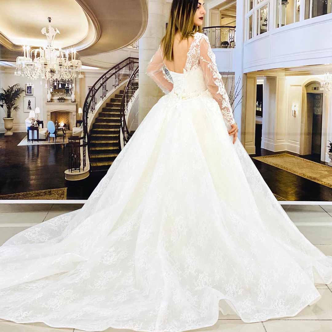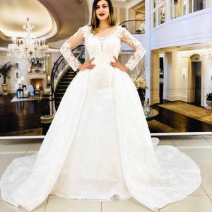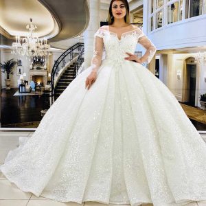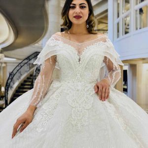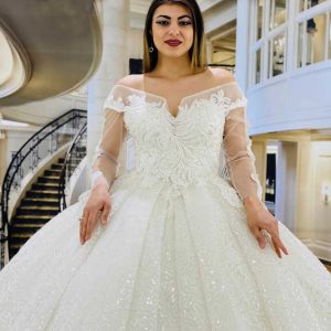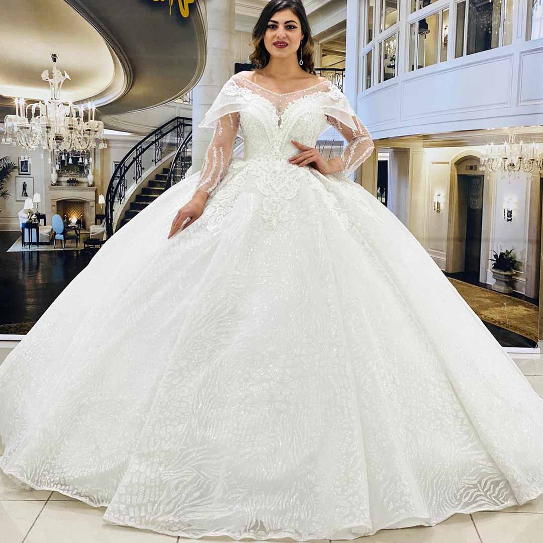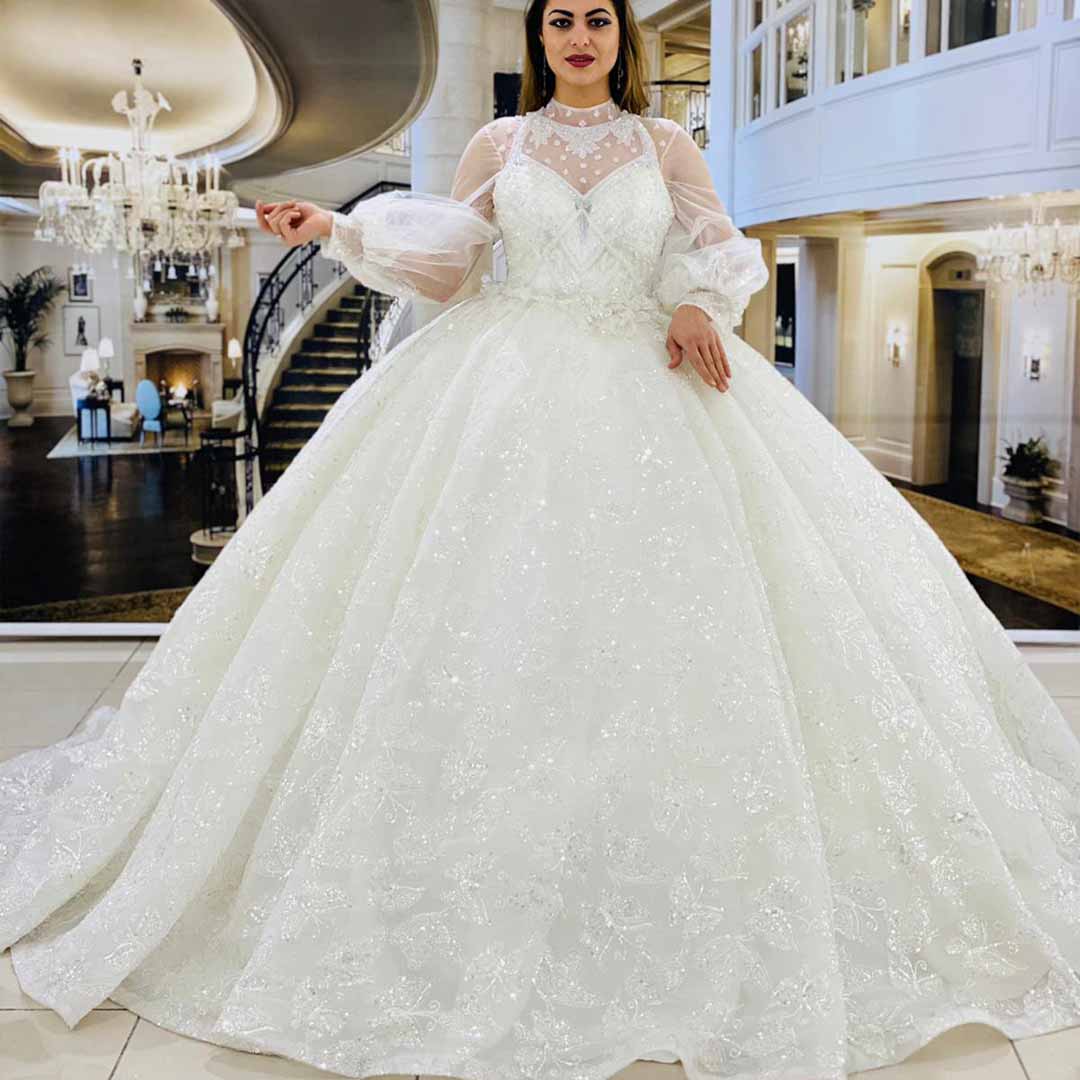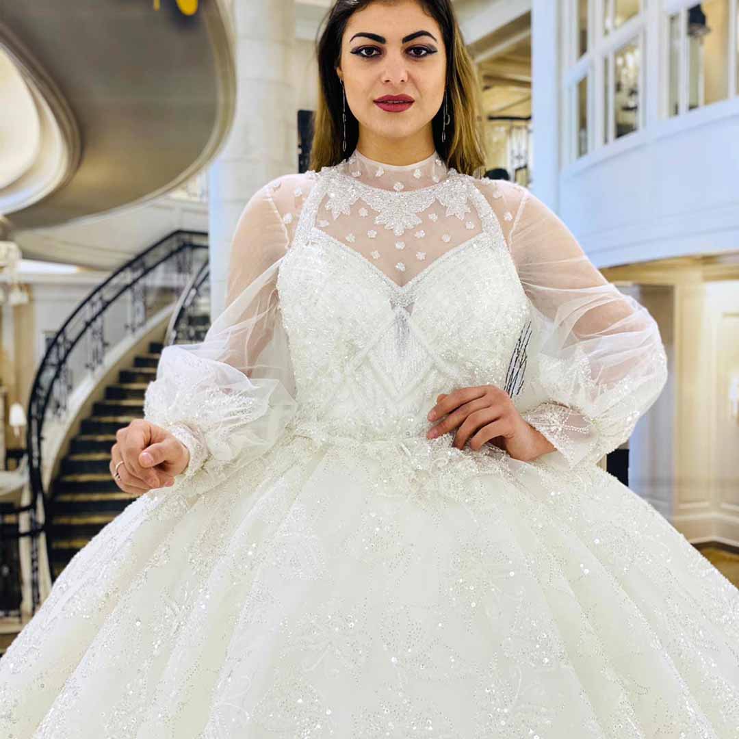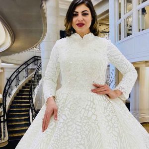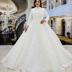 يوجد لدينا خيارات كبيرة وتصاميم متنوعة من بدلات العرس ذات الاكمام الطويلة والياقة العالية المشغولة بحرفية
